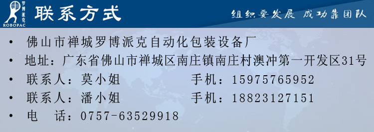 佛山市禅城罗博派克自动化包装设备厂,座落于广东省第三大城市--佛山市,是一家从事自动化包装设备非标生产的企业,帮包装设备品牌贴牌的厂家,本厂技术力量雄厚,针对市场不断提高自动化包装设备的要求,不断研发各种款式自动化包装机械。