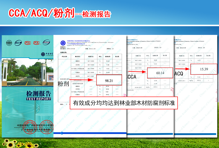 7、防腐效果:通过CCA木材防腐剂处理的木材可保证在40年内不受腐朽。