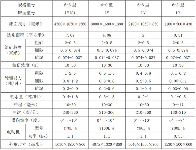 6-S摇床分选性高,原矿经过一次选别即可得到精矿,中矿和废弃尾矿,可同时接出多个产品。精矿的富集比高,选别效率高,看管容易,便于调节冲程。