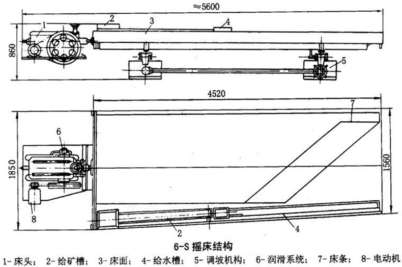 6S摇床主要由传动机构(含床头、电机)、给矿给水槽、床面、调坡机构(鞍型基座)和槽钢支架五大部分组成。