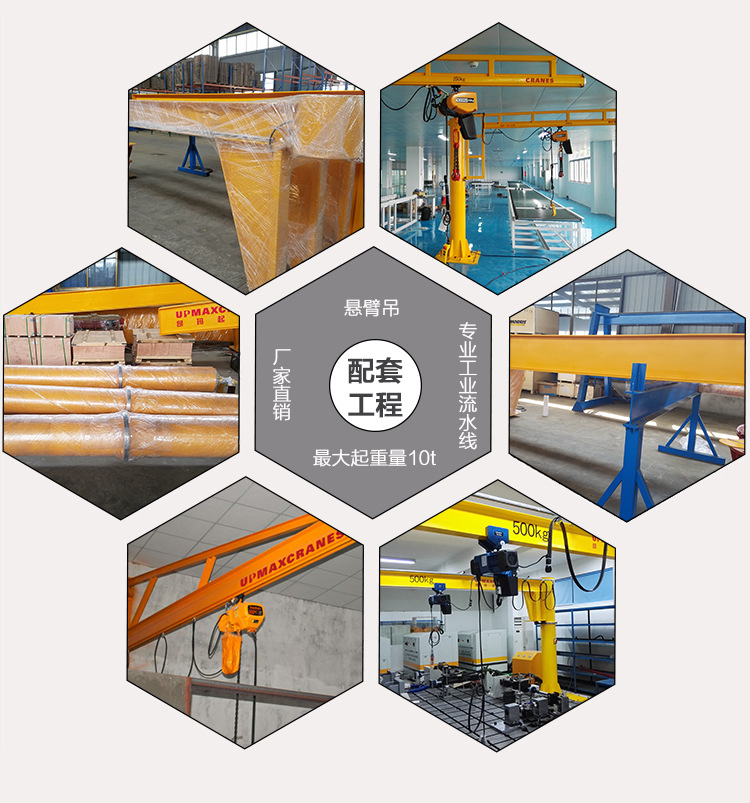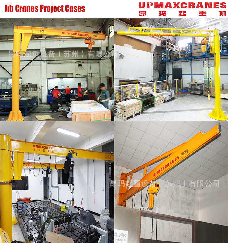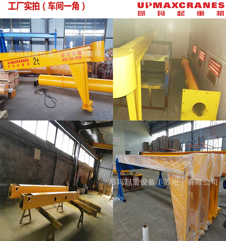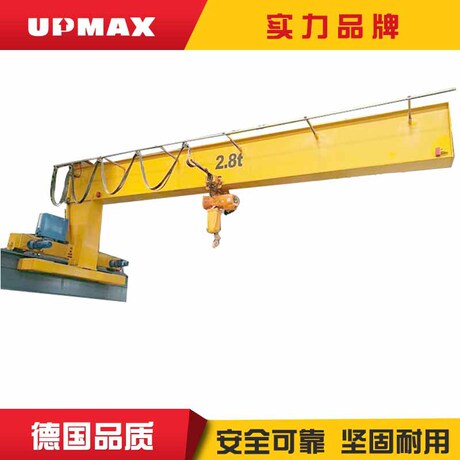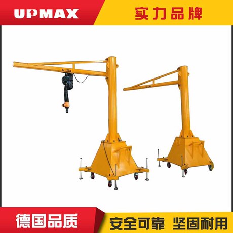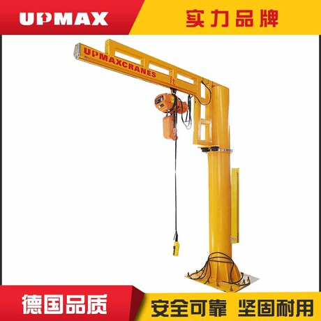 UPMAX昂玛起重机工作强度为轻型,起重机由立柱,回转臂回转驱动装置及电动葫芦组成,立柱下端通过地脚螺栓固定在混凝土基础上,由摆线针轮减速装置来驱动悬臂回转,电动葫芦在悬臂工字钢上作左右直线运行,并起吊重物。起重机旋臂为空心型钢结构,自重轻,跨度大,起重量大,经济耐用。内置式行走机构,采用带滚动轴承的特种工程塑料走轮,摩擦力小,行走轻快;结构尺寸小,特别有利于提高吊钩行程。