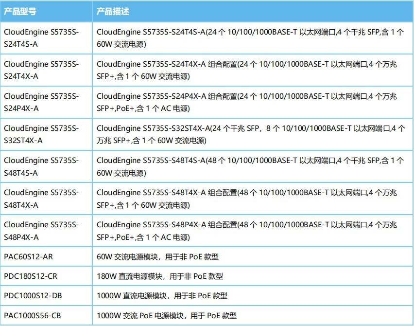 S5735S-S24T4S-A S5735S-S24T4S-A(24 个 10/100/1000BASE-T 以太网端口,4 个千兆 SFP,含 1 个60W 交流电源