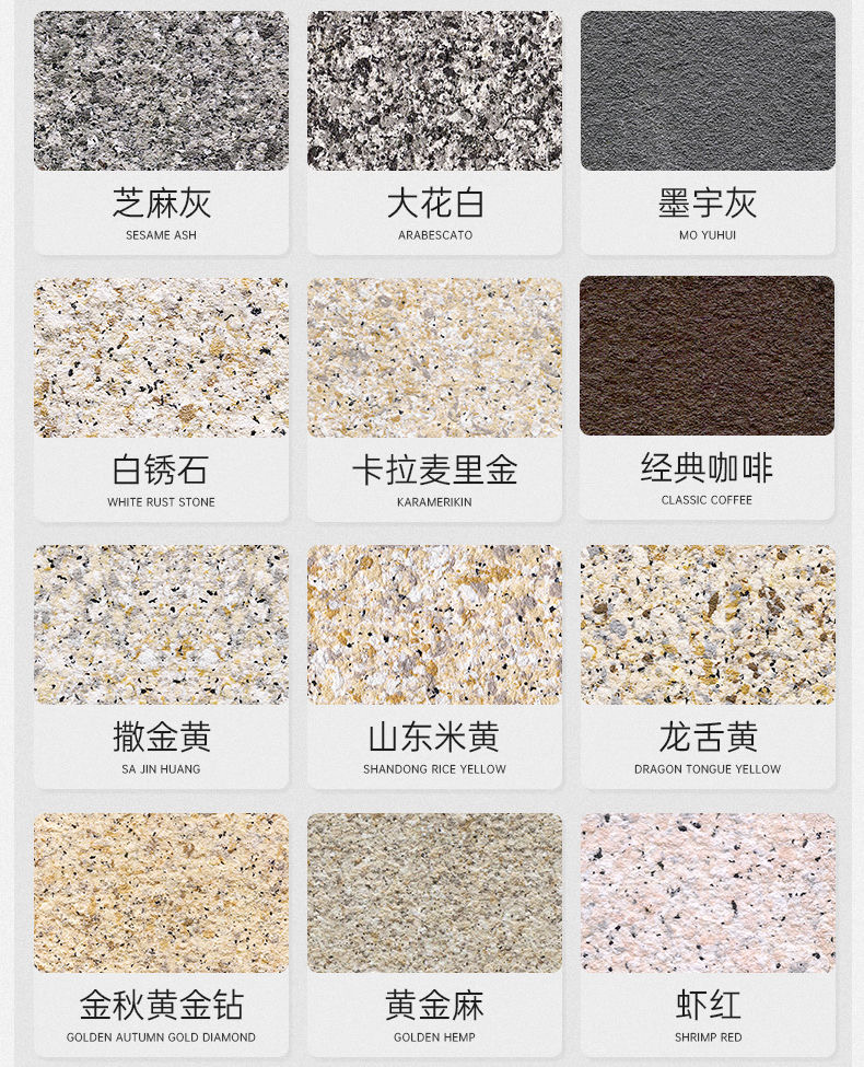 仿石漆的优势装饰性强:仿石漆为建筑设计打开了创意之门,摆脱天然石材颜色、纹理单一的局限,设计师可根据项目需求定制个性化方案,从古朴典雅到现代简约,从异域风情到中式韵味,轻松打造的建筑外观,让每一栋建筑都成为城市中的视觉焦点。性价比高:相较于天然石材,仿石漆无需高昂的开采、切割、运输成本,大幅降低了建筑外墙装饰费用。以一平方米的装饰面积计算,仿石漆材料加施工成本仅为天然石材的三分之一到二分之一,却能实现相近的装饰效果,为建筑项目节省大量资金投入。施工便捷:采用喷涂工艺,仿石漆施工不受墙面形状、高度限制,无论是高层建筑的外墙,还是造型复杂的欧式雕花、弧形墙面,都能均匀覆盖。施工速度快,熟练工人一天可完成数百平方米的喷涂作业,大大缩短建筑装饰周期,加快项目交付进度。环保节能:水性配方的仿石漆,以水为溶剂,挥发性有机化合物(VOC)含量极低,符合国家环保标准,无毒无味,既保障施工人员健康,又不会对室内外环境造成污染。同时,其良好的保温隔热性能,有助于调节建筑室内温度,降低空调能耗,实现建筑节能目标。耐用持久:仿石漆涂层具备的耐候性、耐水性、耐碱性与抗紫外线能力,经得住风吹雨打、日晒雨淋,长期暴露室外不褪色、不开裂、不剥落。正常情况下,一次施工可保 15 - 20 年如新,减少建筑外墙翻修频次,降低维护成本。