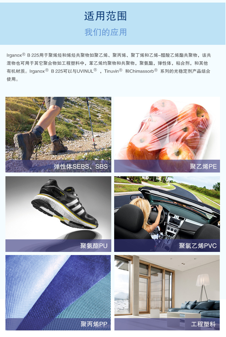 应用IRGANOX B 225应用范围包括聚烯烃,如聚乙烯,聚丙烯,聚丁烯,EVA。亦可用于工