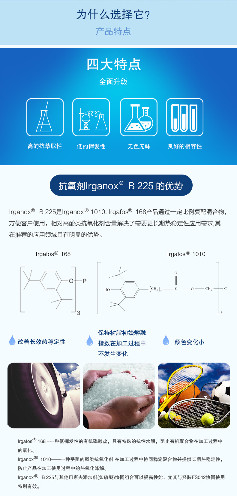 功能IRGANOX B 225为二元经典复配抗氧剂。其中位阻酚含量较高,强调长效稳定性。