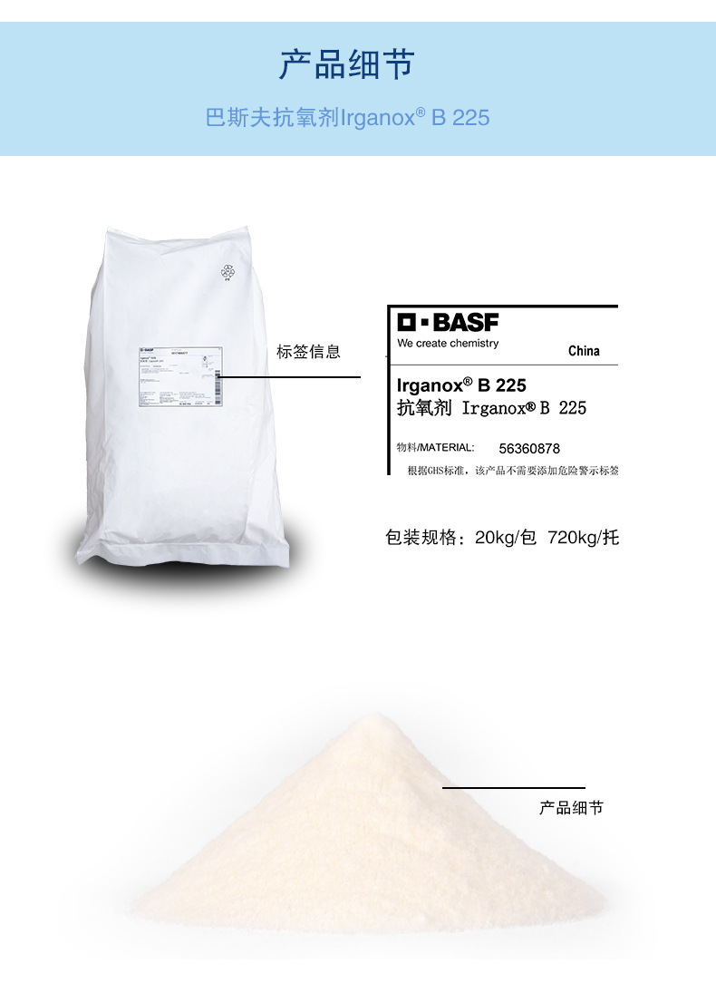 CIBA抗氧剂B225外观为白色粉末或颗粒,挥发份≤0.5%,灰份≤0.1%,溶解性澄清