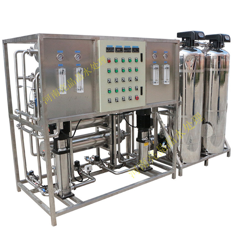 原水→ 原水箱 → 原水泵 →多介质过滤器 (石英砂过滤器)→活性炭过滤器 →软水处理器 → 精密过滤器 → 一级高压泵 → 一级反渗透(RO)装置 → 纯净水箱 → 二级高压泵→二级反渗透→紫外线杀菌装置 → 用水点