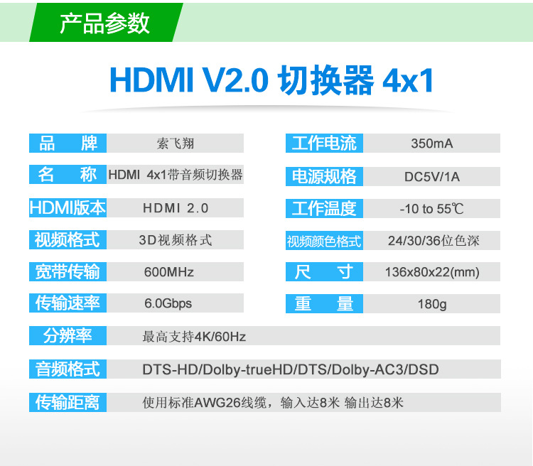 支持使用标准HDMI 2.0 线缆时,输入传输距离达3米,输出传输距离达5米(4K/60HZ分辨率)
