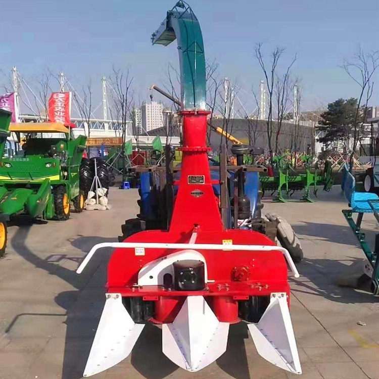 该机器是有拖拉机前置将主机悬起,通过拖拉机后输出轴与主机输入轴联接实现传动,前置不用人工开趟,不用改装农用车,接装简单,工作效率高,拖拉机后方直接牵引拖车,针对双行青/黄玉米收获机效果很好,能够一次完成对作物的收割、喂入、切碎并抛至拖车等项工作。方便、省工、省力。取消了现有青饲收获机复杂的传动系统,减少油耗降低成本、传动结构简单、维修容易。