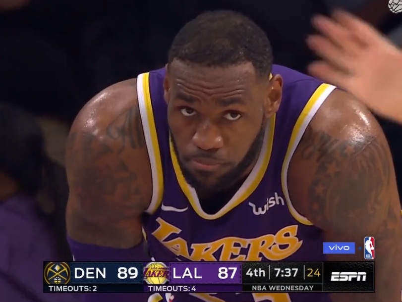 末节詹皇提前上场,试图帮助球队缩小分差,双方少的时候只差2分,不过重要时刻。湖人球员哈特漏人,掘金哈里斯命中重要三分。自此湖人没有追上的机会,双方分差进一步拉大,詹姆斯也提前下场休息。