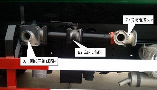 由管道、四位三通球阀、直通球阀、过滤网、出水口(前冲后洒、侧喷;高位侧花洒;后工作平台,带绿化洒水高炮)组成。