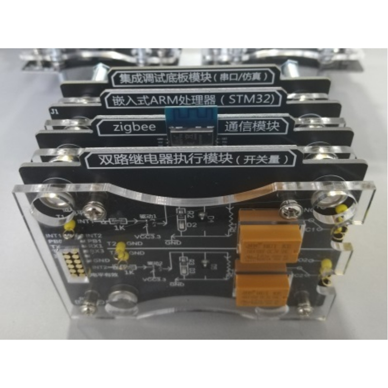 基础实验模块:ZigBee模块(8个)、WIFI模块(1个)、蓝牙4.0模块(2个)、嵌入式网关(Linux/Andriod系统,1个)、STM32单片机模块(4个);