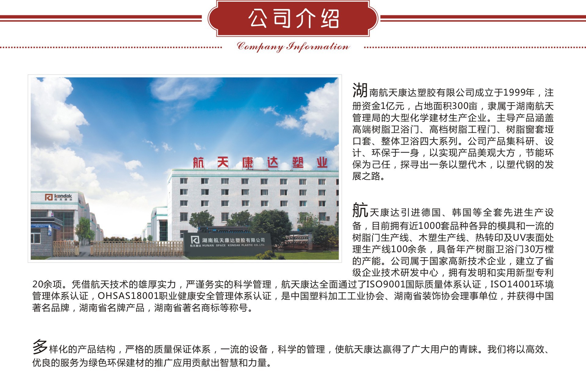 湖南航天康达塑胶有限公司是管材、集成墙顶、树脂门、柜体、窗套垭口套等产品生产加工的公司,拥有完整、科学的质量管理体系。湖南航天康达塑胶有限公司的诚信、实力和产品质量获得业界的认可。欢迎各界朋友莅临参观、指导和业务洽谈!
