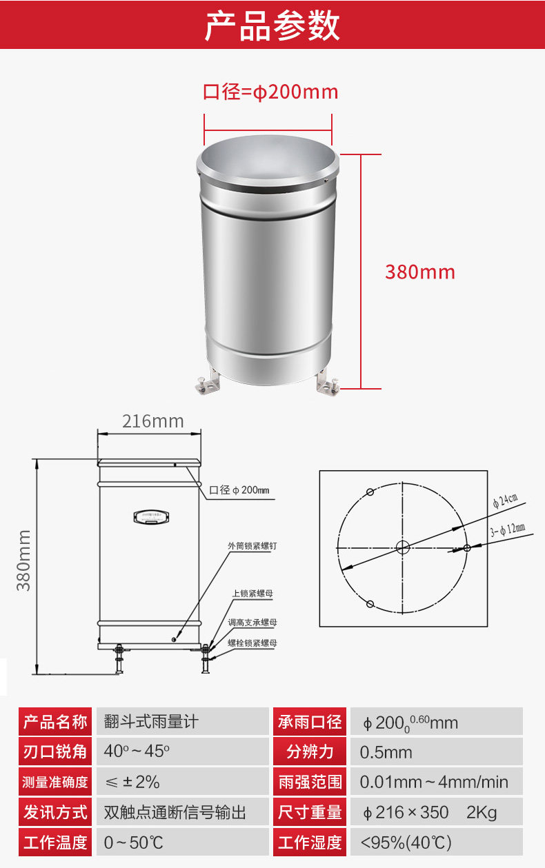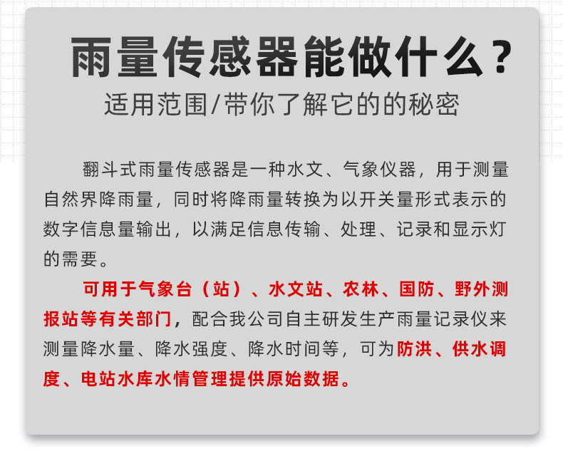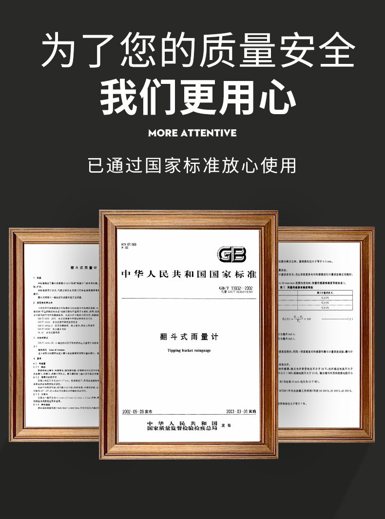 本仪器为降水量测量一次仪表,其性能符合国家标准 GB/T11832-2002《翻斗式雨量计》要求。本仪器的核心部件翻斗采用了三维流线型设计,使翻斗翻水更加流畅,且具有自涤灰尘、容易清洗的功能。
