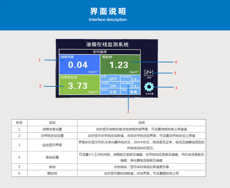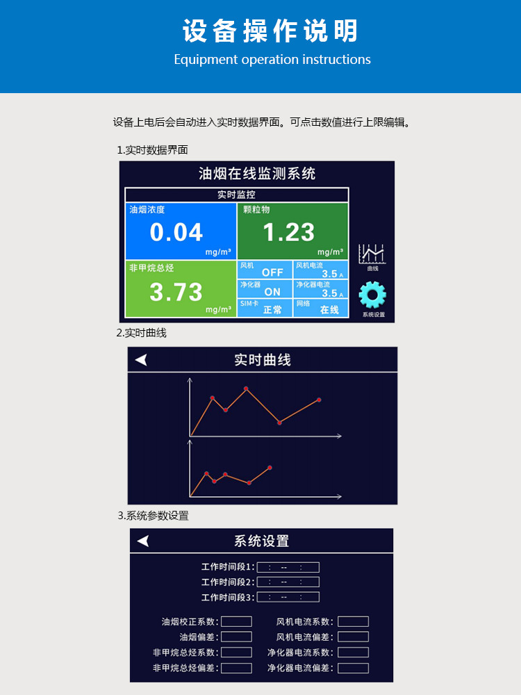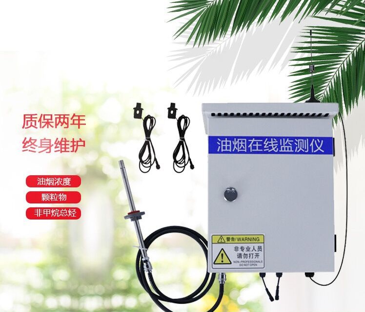 1. 系统概述RS-LB-300 是我司响应国家对餐饮行业油烟进行监管,所设计的一款油烟在线监测主机。主机能够对餐厨排烟管道的油烟浓度、颗粒物浓度、非甲烷总烃(NMHC)浓度进行 24小时不间断测量,并上传我司免费的监控平台或监控平台。为了防止商家净化器或风机不启动,主机还可通过电流互感器采集两路电流信号,监控净化器或风机是否真实启动。为方案安装人员操作,整机采用 7 寸电容触摸屏,全中文界面设置简单易懂。主机带有 1 路 GPRS(可选 4G)通信接口,可插入普通或物联卡进行数据上传,有手机信号的地方就可以把数据上传出去。针对油烟监测现场油烟成分复杂的问题,我司设计了专用的传感器,可分析油烟浓度、颗粒物浓度,并且不会受到餐厨中蒸锅、笼屉等产生的大量蒸汽的影响,监测更。采用合理的气路设计、先进的油气分离装置,可达到长时间运行免维护,长可半年维护一次。1.1 功能特点? 实时监测油烟浓度、颗粒物浓度、非甲烷总烃浓度,并可设置上限值,超限自动报警。? 2 路电流检测,能够同时检测风机和净化器是否工作,可根据风机和净化器功率大小设置检测电流报警值,适应所有功率的风机和净化器。? 采用开口式电流互感器,不用剪断风机或净化器线缆即可测量。? 可设置三个独立的工作时间段,时间段内超限才报警,时间段外超限不报警。? 1 路 GPRS(可选 4G)通信接口赠送 1 年物联卡,数据可直接上传我司提供的免费云平台、油烟监控平台或客户的平台。? 7 寸电容触摸屏操作简单。全中文操作界面,美观大方。? 交流 220V 供电、IP65 防护等级,可常年工作于室外,不惧淋雨日晒。