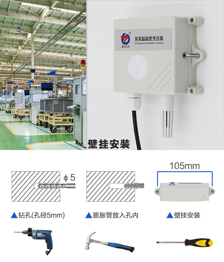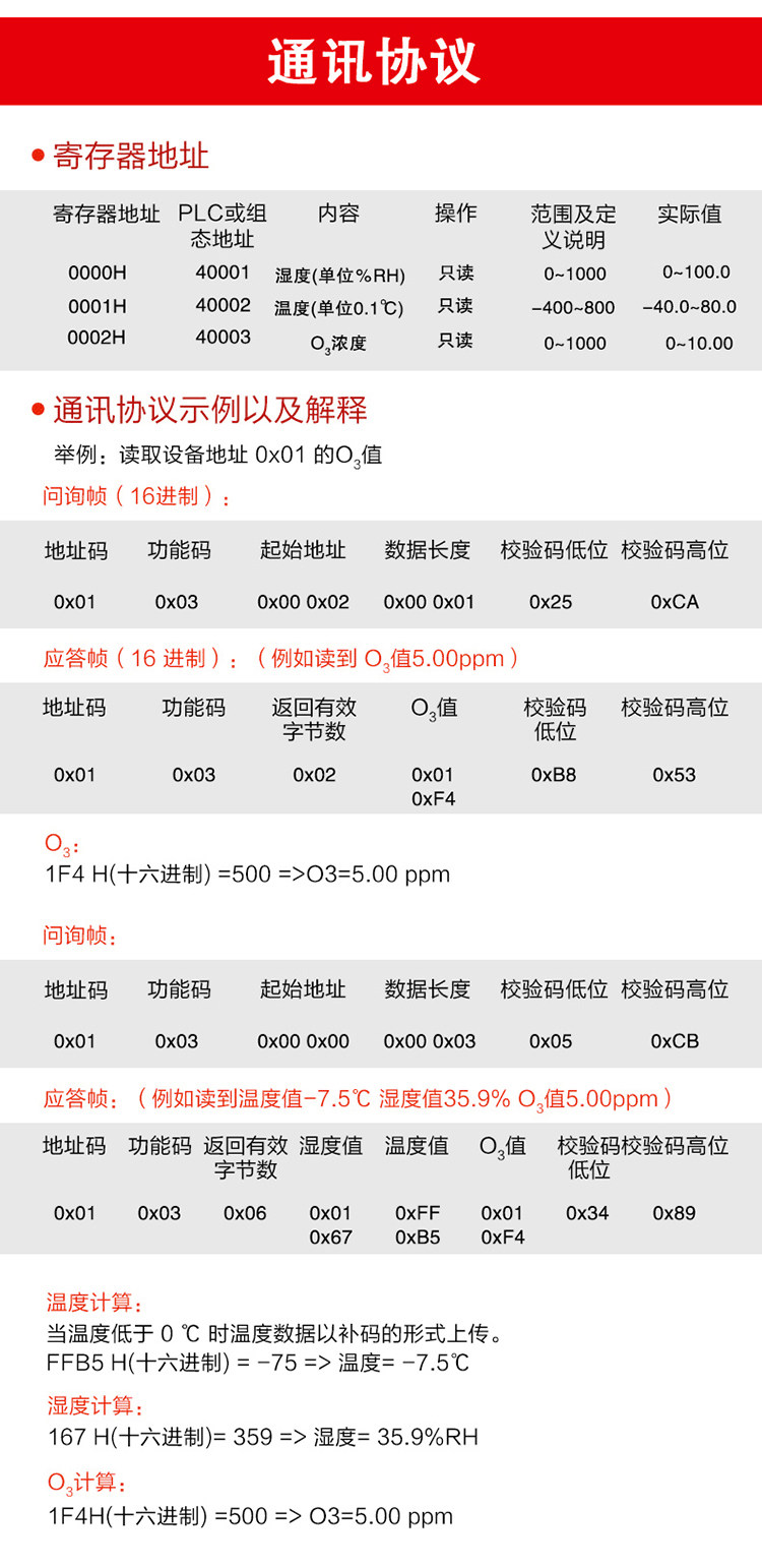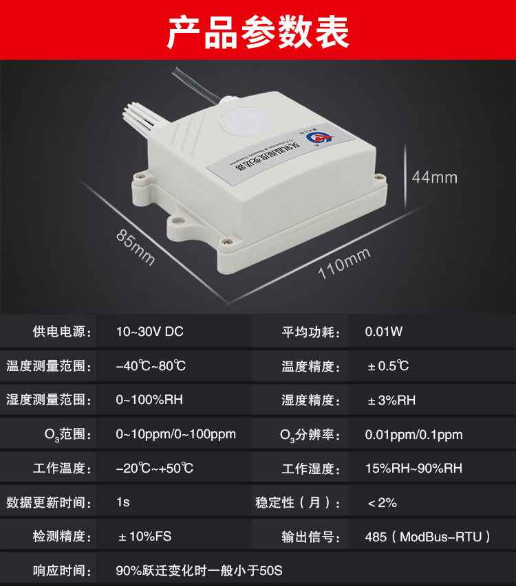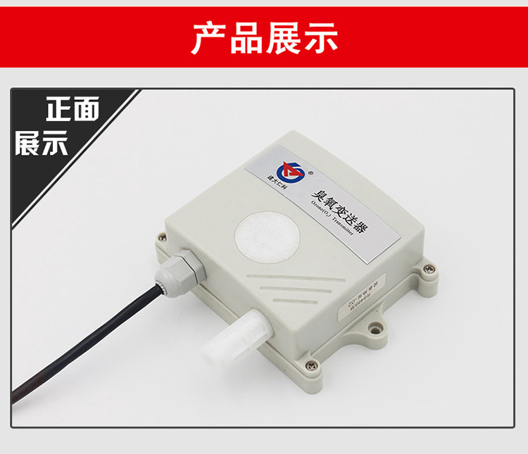 1.1 产品概述O3广泛用于水消毒、食品加工净化、食品贮藏保鲜、医疗卫生和家庭消毒净化等方面,在臭氧应用中,一定浓度的臭氧是保证消毒效果、节约能源和防止污染的重要参数。但是如果环境中的臭氧浓度过高会对人体产生危害,因此有效监测臭氧的浓度是非常有必要的。该变送器采用电化学技术进行O3浓度测量,反应迅速灵敏,可以可靠的检测出臭氧浓度。该产品使用485通信,标准ModBus-RTU通信协议,通信地址及波特率可设置,远通信距离2000米。设备10-30V宽压供电,外壳防护等级高,能适应现场各种恶劣条件。1.2 功能特点■采用美国进口高灵敏度的气体检测探头,并且使用高性能信号采集电路,能测量 PPM级 O3 浓度,信号稳定,准确度高。■测量量程为 0-10.00ppm(默认)。■485 通信,采用标准 ModBus-RTU 通信协议,通信地址及波特率可设置,远通信距离2000 米。■产品采用壁挂式防水壳,安装方便,防护等级高。1.3 主要技术指标供电电源 10~30V DC平均功耗 0.01W输出信号 485(ModBus-RTU)温度测量范围 -40℃~80℃温度精度 ±0.5℃湿度测量范围 0~RH湿度精度 ±3%RH臭氧测量范围 0~10.00ppm、0~100ppm工作温度 -20℃~+50℃工作湿度 15%RH~90%RH数据更新时间 1s重复性 <5%输出值稳定性(月) <2%响应时间 90%阶跃变化时一般小于 50S分辨率 量程 0~10ppm:0.01ppm量程 0~100ppm:0.1ppm精度 ±10%FS