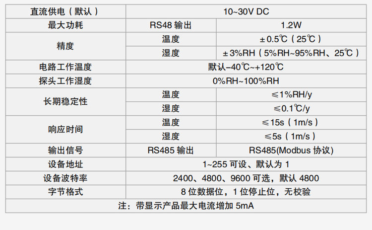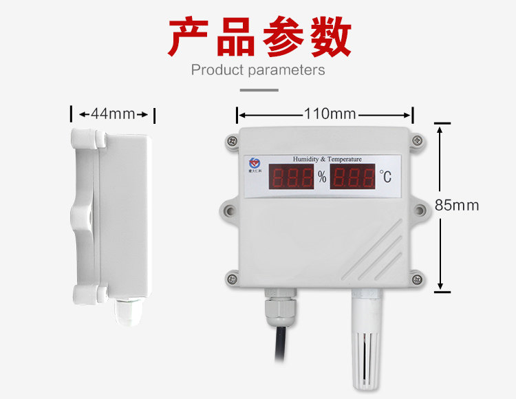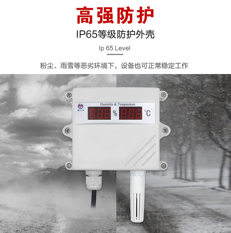 该变送器采用壁挂防水壳, 多用于室外及现场环境恶劣的场合。 RS-WS-*-SMG-*温湿度变送器具有显示功能, 实时显示当前温湿度。探头多种类型可选适用于不同现场, 广泛适用于通讯机房, 仓库楼宇以及自控等需要温度监测的场所。 采用标准工业接口4~20mA/0~10V/0~5V模拟量信号输出,可接入现场数显表、 PLC、 变频器、 工控主机等设备。 安全可靠, 外观美观, 安装方便。