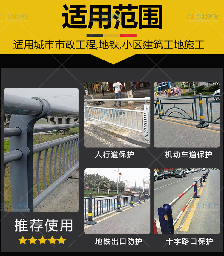 (2)公路市政交通栏杆、品种多,可以任意选择高度、色彩。适用城市交通要道、高速公路中间绿化隔离带、桥梁、二级公路、乡镇公路及各公路收费口等的隔离。