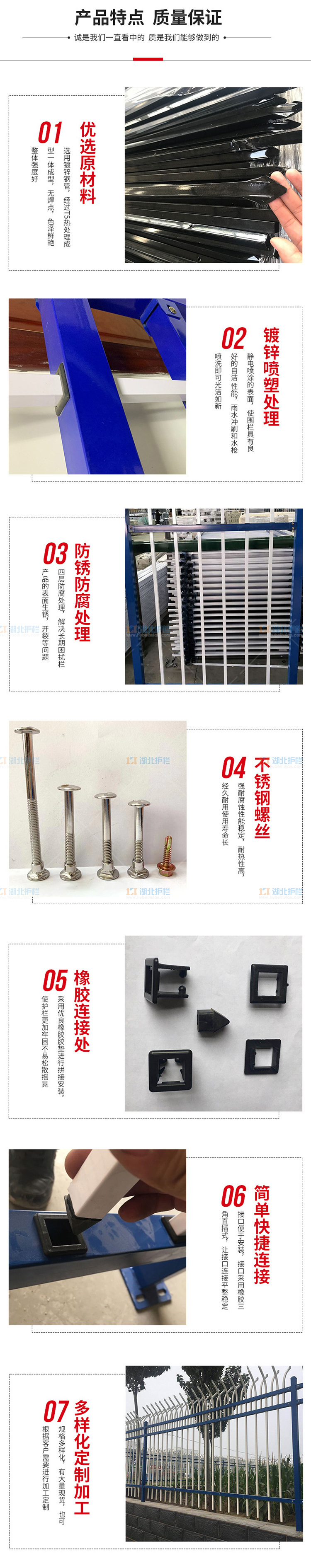 (2)加厚锌钢护栏围栏片长默认3米,每隔3米配一根立柱,标准高度1.5米,片长和高度可根据客户要求定做 具体详询客服