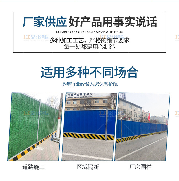 湖北护栏湖北随州围挡销售厂家是一家集技术开发、设计、制造、销售、服务为一体。主要产品分类:锌钢栅栏护栏、防盗锌钢围栏、建筑围墙栅栏、防护锌钢围栏、高低铺铁床、市政仿古栏杆等。 质量承诺:本公司的建筑工地施工隔离防护栏,通过技术人员层层把关,我厂严格按照标准生产供货。原材料采购进厂检测,生产严格按照工艺流程的每一个环节,精细加工,严谨生产,细致检测,包装,及时安全准时送货,确保客户满意。 售后服务:我公司设有售后服务部,坚持做好售前、售中、售后服务,对产品实行终身维修,定期上门检查,发现问题及时解决,对用户在使用过程中造成损坏,长期优惠供应易损零部件,让消费者权益得到的保证,使用户放心满意