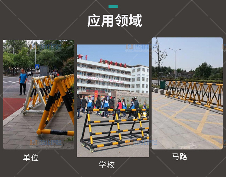(2)湖北护栏弹力警示柱用途:道路路口,学校门口,赛场出口,入口,此产品满足大型活动通道,体育赛事隔离,安检口蛇形通道,临时隔离通道等。应当具有较好的整体强度和抗冲击以及防攀越、防拆卸、防破坏能力。用于完成对现场的封控,对保护目标、区域与防范对象起到限制、阻挡、威慑和警示作用的装置。防暴阻隔网单片主体为宽1.5米、高2.5米的金属框架结构及钢丝网,并带有支撑杆和连接插销。通常情况下是多片连接组合使用,以满足需要的布障宽度。该产品具有结构简单、布障迅速、坚固可靠等特点。
