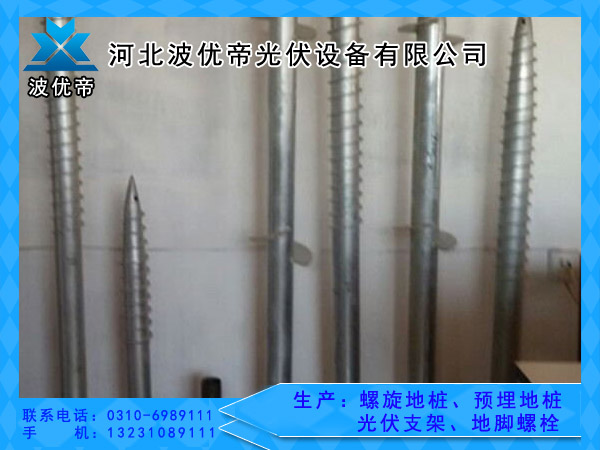 河北波优帝光伏设备有限公司生产制造的螺旋地桩 预埋地桩及各类规格的光伏支架,质量有保障,价格有优势,是广大用户信任依赖的品牌。我公司经营的产品规格型号齐全完善,皆支持来电来图定制服务。