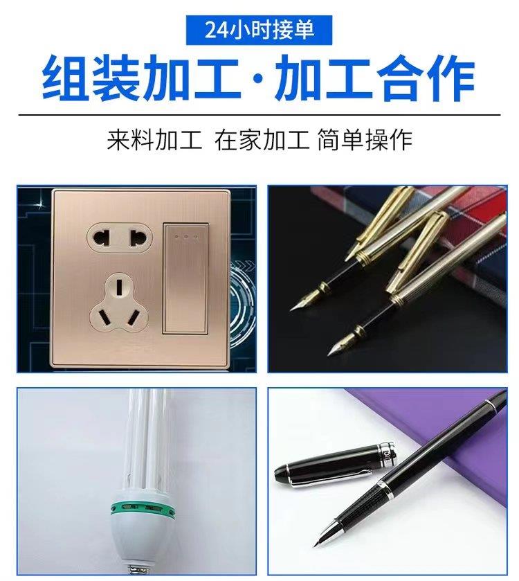 我厂主要批发加工产品:电子电器组装,led节能灯具、led照明系列,文具笔类组装。真诚希望您把握机遇,真诚合作,共创美好未来,您负责加工组装,我厂统一回收,收一单结一单,按件计算。有意向欢迎留言!