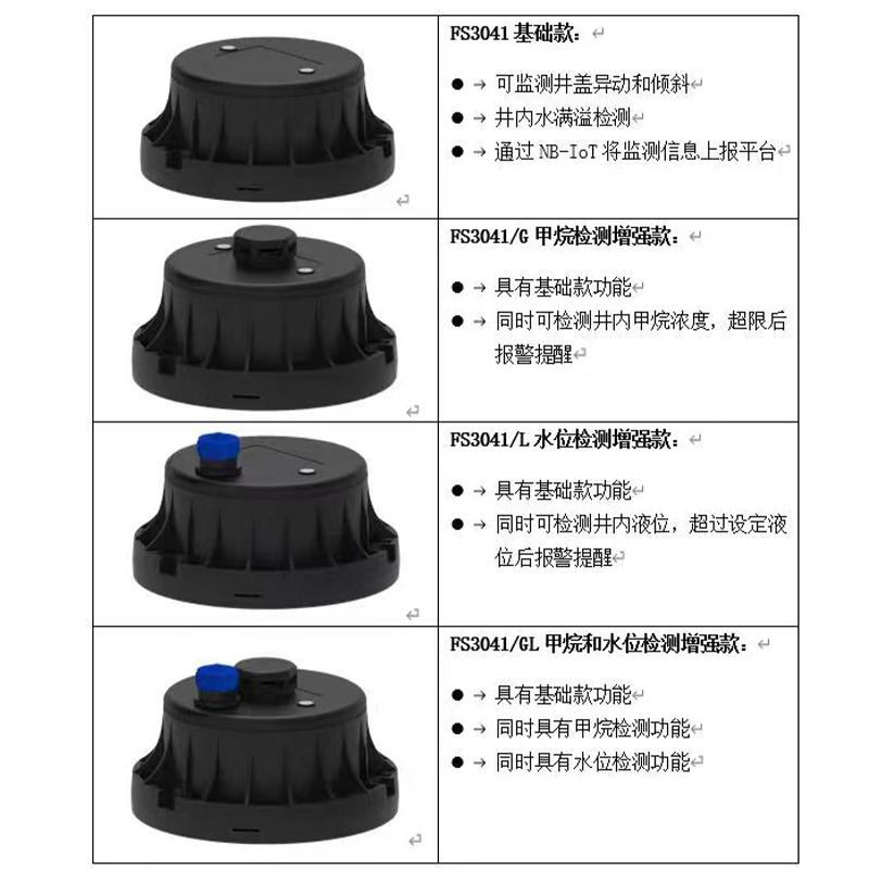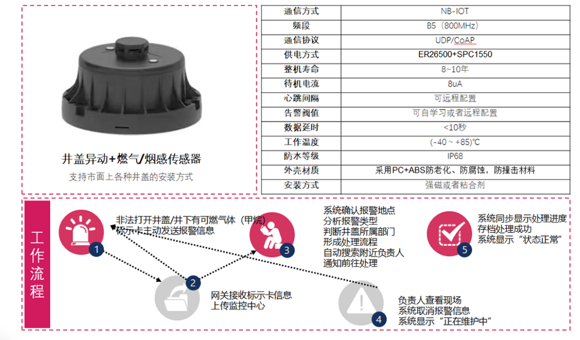 智能窨井盖、智能井盖监测终端,采用NB-IoT低功耗广域网技术,内置天线、电池供电,对井盖运行状态进行智能监测、异常实时告警。设备安装简单、防水防尘、耐候性好,能适合各种材质井盖安装维护,无任何外置配件,不易损坏。设备搭配通讯终端可有效对公共设施进行管控,保护道路安全。