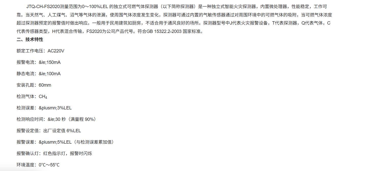JTQ-CH-FS2020测量范围为0~100%LEL 的独立式可燃气体探测器(以下简称探测器)是一种独立式智能火灾探测器,内置微处理器,性能稳定,工作可靠。当天然气、人工煤气、CH4等气体的泄漏,使周围气体浓度发生变化,探测器可通过内置的气敏传感器通过对周围环境中的可燃气体的吸附,当可燃气体浓度超过探测器预定的警报值时做出响应。一般用于民用建筑如厨房,不适合用于通风良好的场所。探测器型号中J代表火灾报警设备,T代表探测器,Q代表气体,C代表传感器类型,H代表混合传输,FS2020为公司产品代号。符合GB 15322.2-2003 国家标准。