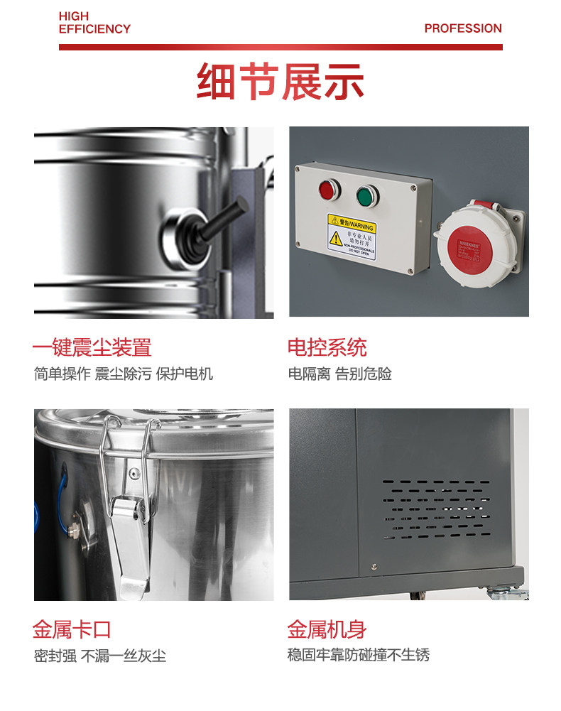 振尘装置是工业吸尘器的进步重要标志,它能有效防止滤网堵塞。手动振尘装置可以有效清理过滤网外层的灰尘杂物,防止机器长时间工作导致滤网堵塞,让吸力持久不减。