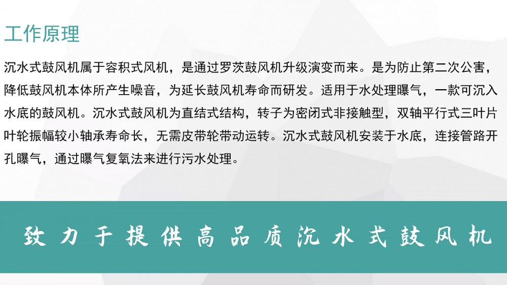 较低的能源损耗:沉水式鼓风机高转速可减少逆流,相对也减低能源耗损。