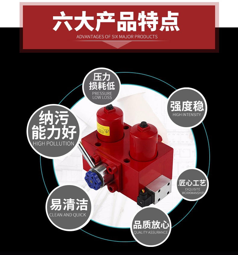 该高压过滤器由两只单筒过滤器,换向阀、旁通阀、发讯器等组成,能使系统在不停机状况下更换滤芯,使用于连续工作的液压系统。