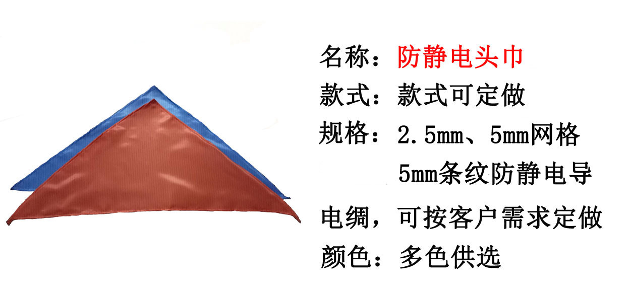 防静电头巾是采用涤纶长丝与高性能导电纤维经特殊工艺织造而成,用此种面料经特殊缝纫工艺制成的洁净服装具有优良持久的防静电防尘性能,能有效地释放人体静电电荷。洁净绸织物密度要大于普通丝绸织物、达到不起毛、不起球、不脱落纤维、不起尘、不透尘、气密性好。