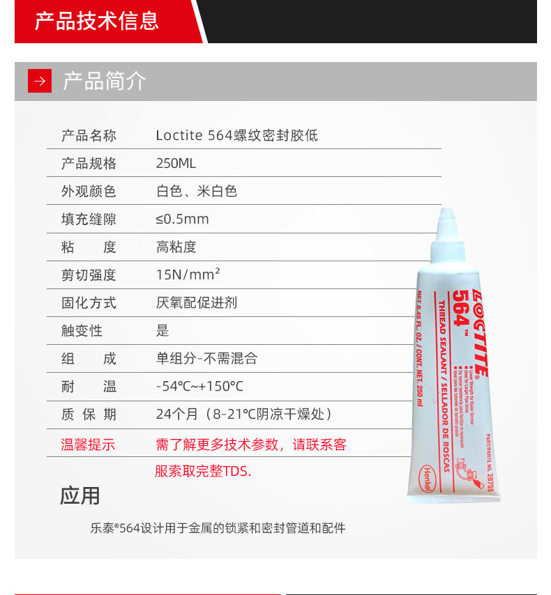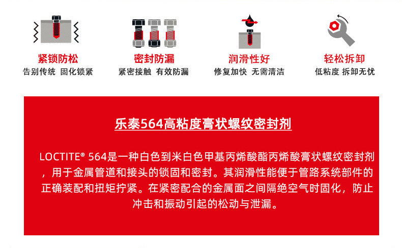 乐泰564管螺纹密封胶适用于大直径管道,低强度。