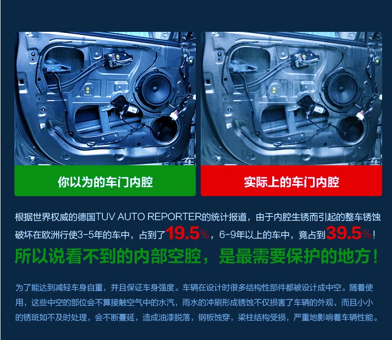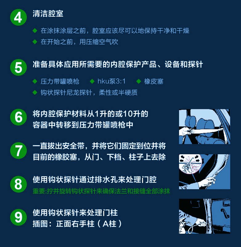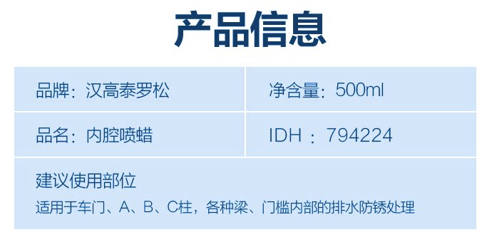 TEROSON Cavity Spray 描述 TEROSON WX 215是一种具有爬覆性能的防腐内腔蜡。可以用于处理局部区域内腔防锈,并可用于基于PVC、PVC蜡、沥青/橡胶和橡胶/树脂的涂层上。该产品是OEM产品。它具有耐高温特点。罐上装配有延长喷管,可延伸到空腔内部,例如:车门和发动机舱内部。 产品特征 车身修复 – 防腐:含有内腔蜡和防成分,的爬覆性能,耐高温性能。 优势 ?是钣金维修过程中的内腔防锈理想产品 ?的爬覆性能 ?耐高温 ?易于操作,喷雾罐包装 ?可用于基于PVC、PVC蜡、沥青/橡胶和橡胶/树脂的涂层上 有,库存充足,欢迎大家订购。
