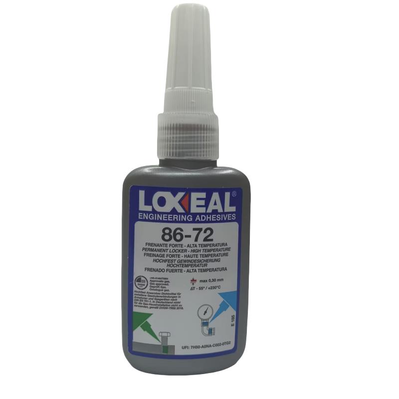 乐赛尔86-72胶水是意大利LOXEAL品牌的高强度厌氧型螺纹锁固密封胶,以下是核心信息: 基础参数 - 类型:酸酯类厌氧胶。- 外观:红色胶体- 粘度:8000-15000MT(25℃)。- 耐温范围:-55℃至230℃,短期(24小时)可耐受230℃高温。- 填充间隙:0.30mm,适配螺丝直径2英寸(约50.8mm)- 固化时间:初固20-40分钟,完全固化需24小时。- 包装规格:50ml、250ml两种常见规格。 核心特性 - 高强度锁固:剪切强度达10-20N/mm2,拆卸扭矩45-70N·m,抗震防松。- 密封防漏:可阻断气体、水、油等介质泄露,替代聚四胶带。- 适配性强:具备良好触变性,适用于大公差配合的金属螺纹,支持气管连接密封。- 认证齐全:符合DVGW、NSF等认证,可用于食品加工领域。 适用场景 - 工业领域:汽车引擎、机械设备的螺栓锁固,排气管等高温部位紧固件固定。- 日常场景:家电维修、家具安装等需要螺纹加固的DIY操作。- 特殊场景:食品加工设备的螺纹密封,以及气管、油管等管路连接的防漏锁固。 使用与储存 - 使用要点:清洁螺纹表面油污、锈迹;均匀涂胶后装配,施加压力确保贴合;固化期间避免震动。- 储存条件:密封存放于阴凉干燥处,远离儿童及明火。