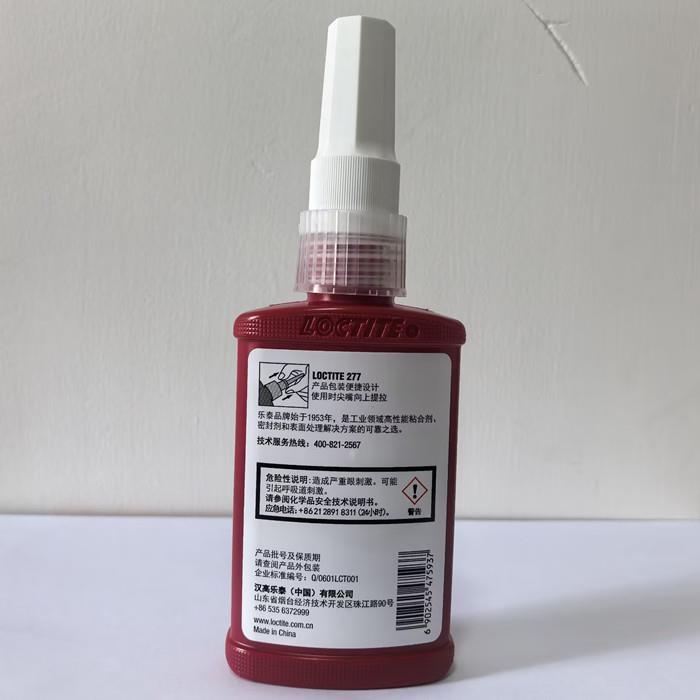 乐泰277是汉高乐泰推出的一款高强度螺纹锁固胶,主要用于大尺寸螺栓和螺柱的锁固与密封 。?以下是其详细介绍:- 产品特性:化学类型为甲基酸酯,外观为红色液体,具有荧光性,便于在维修时通过紫外线照射判断部件上是否已涂覆。它是单组分胶水,无需混合,粘度高且具有触变性,在垂直表面不流淌。- 固化方式 :厌氧固化,在两个紧密配合的金属表面间,与空气隔绝时固化。若材质为非活泼金属或固化速度太慢,可在配合面喷洒促进剂7471或7649来加速固化。- 强度性能 :平均拆卸力矩和平均破坏力矩均为32N.m,强度高,能有效防止因冲击和振动引起的松动和渗漏,可用于M36以下螺纹的锁固与密封。- 固化速度 :在不同金属表面的固定时间不同,在钢上为30分钟,黄铜上为25分钟,不锈钢上为270分钟。- 温度范围 :使用温度范围为-18℃至150℃,能在较宽的温度区间内保持性能稳定。- 应用领域 :适合大尺寸螺栓(M25及以上)和螺柱的性锁固和密封,常用于汽车制造、机械维修、电子产品装配等领域,可防止螺纹生锈及腐蚀。- 符合标准 :符合标准Mil-S-46163A要求,产品质量有保障。