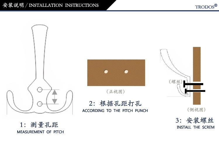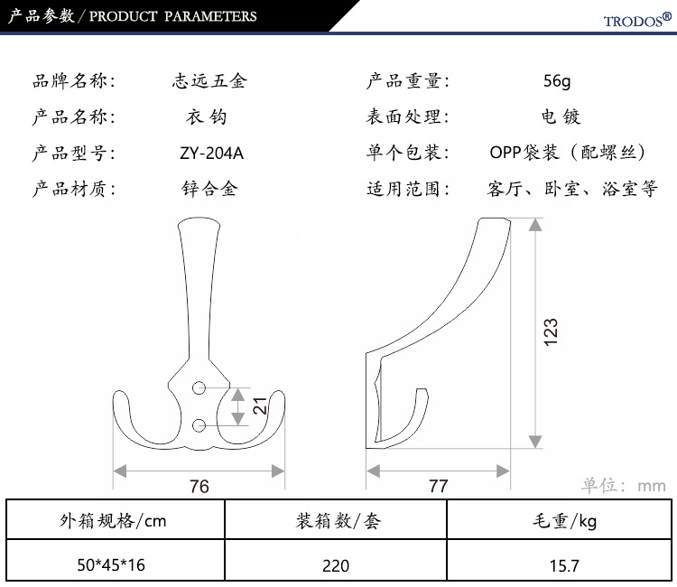 | 品牌名称:TRODOS 志远五金 | 产品名称:挂衣钩 | 产品型号:ZY-204A |