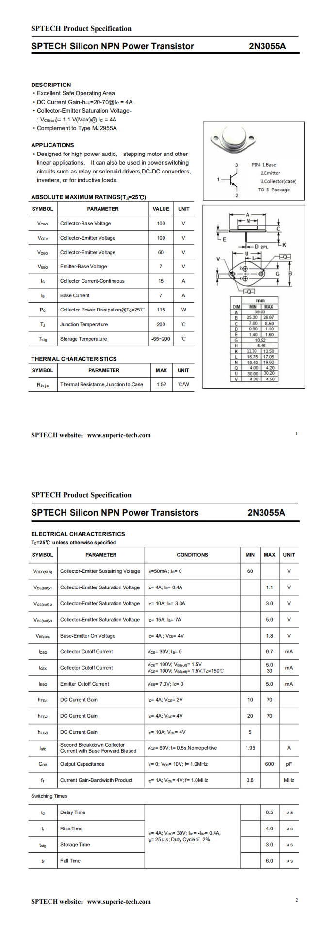 介 绍: 2N3055A采用韩国进口芯片.自主封装.
