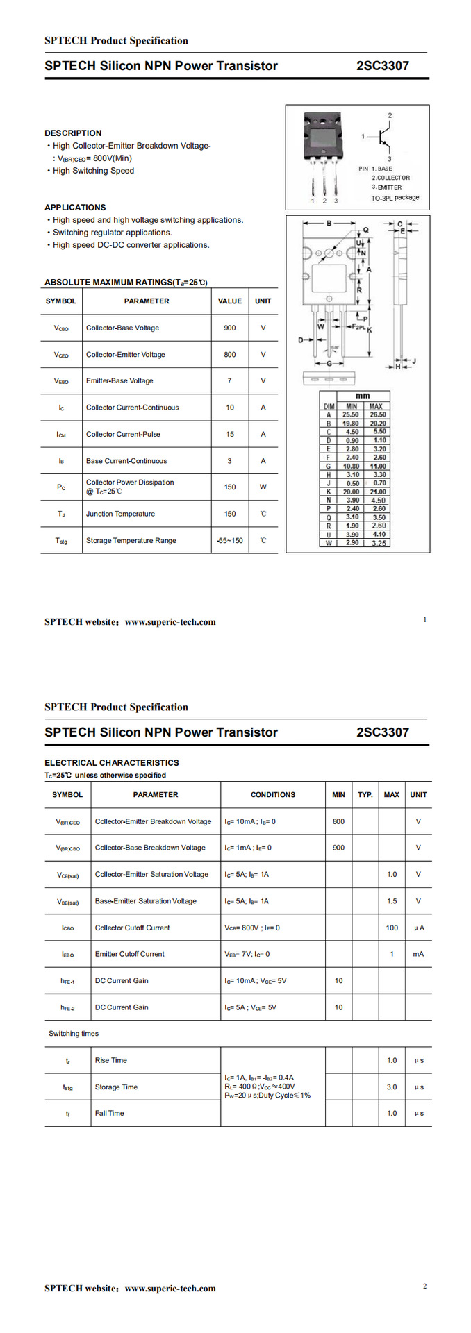SPTECH高品质晶体管 全新高压快速800V 15A 2SC3307 高压三极管