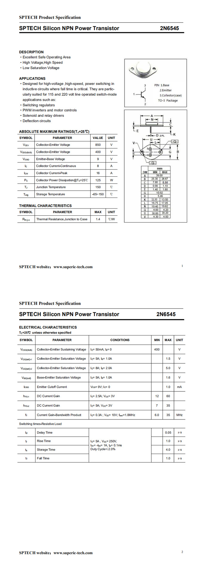 SPTECH全新三极管 全新高压快速400V16A高电压开关管2N6545