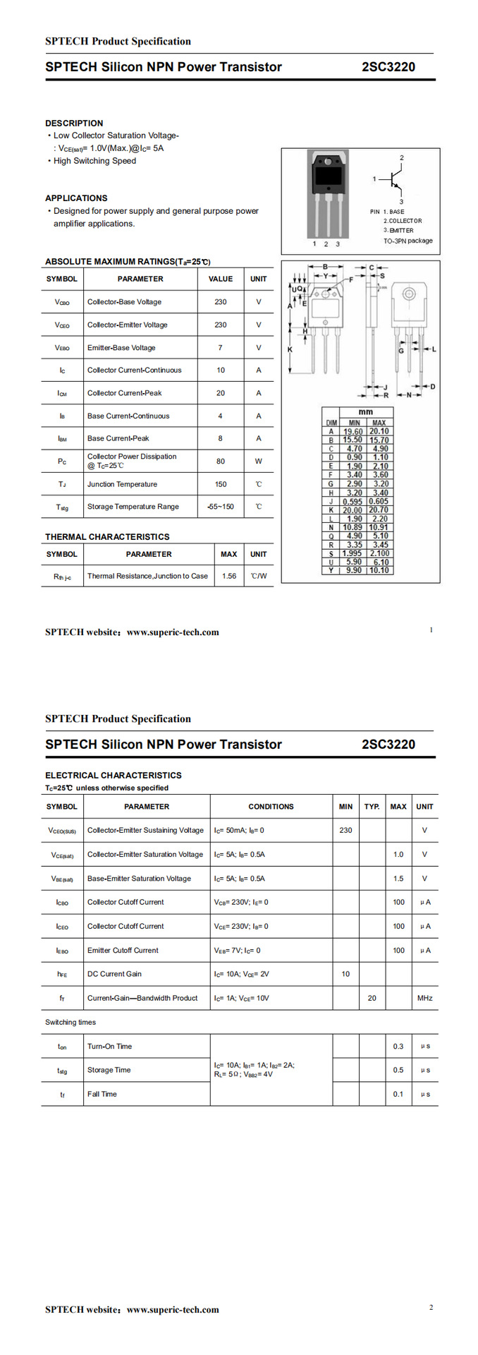 SPTECH晶体管 大电流开关电源专用2SC3220 三极管230v 80W三极管230v 80W