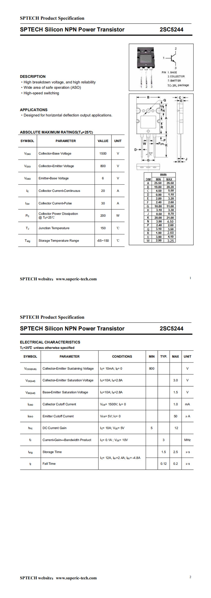 SPTECH高品质晶体管 全新大功率200W 大电流三极管2SC5244 NPN