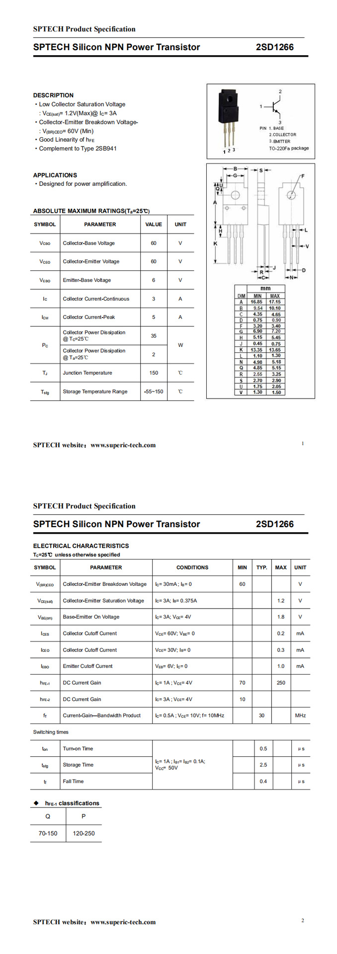 SPTECH全新三极管35w NPN封装 2SD1266大功率 晶体管工厂直供