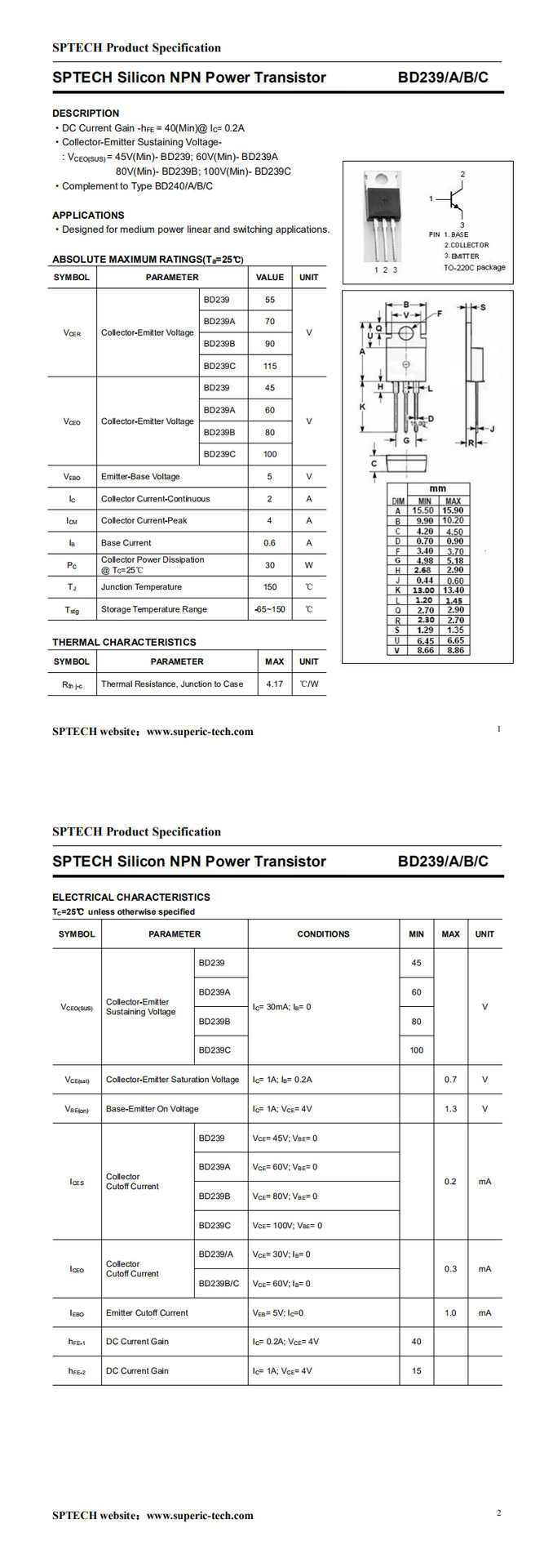 SPTECH NPN硅型大功率大电流原装开关晶体管 55V 4A 30W BD239