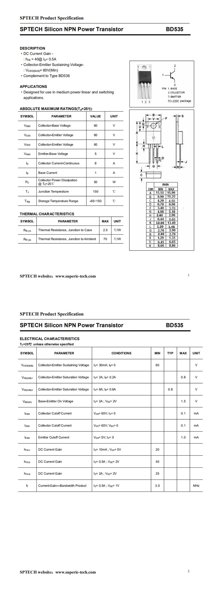 SPTECH全新高压开关管 中功率开关三极管 原装大功率 60V BD535