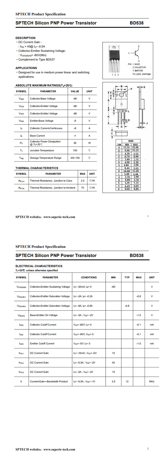 SPTECH 晶体管厂家直供 开关控制器三极管BD538 PNP 大功率管 50W