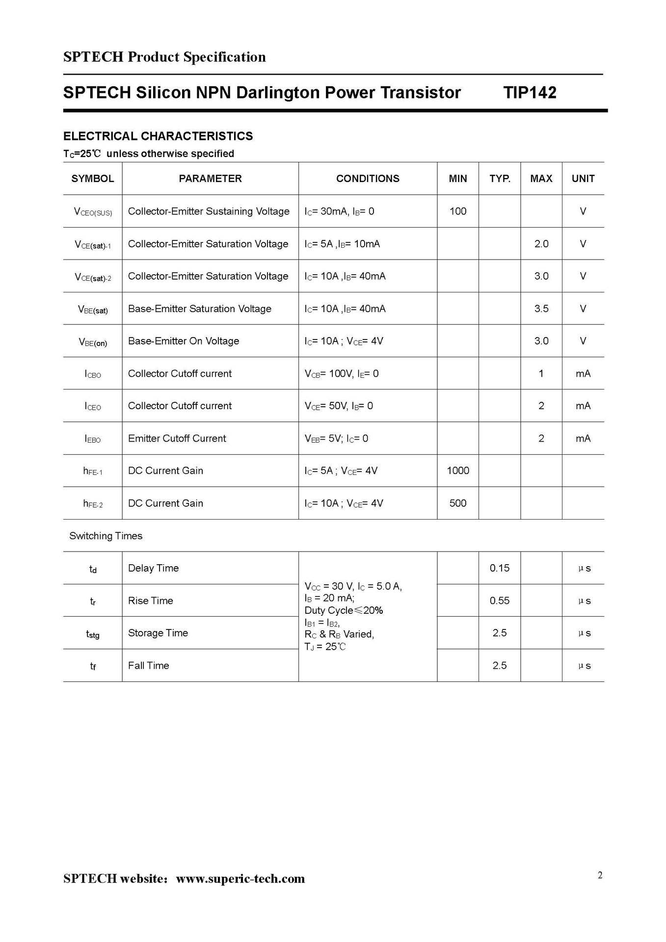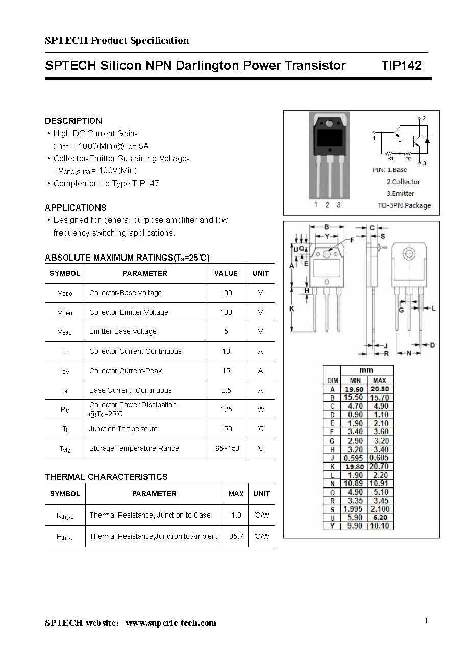 SPTECH三极管 工厂TIP142T达林顿管三极管 直插TO-3PN三极管