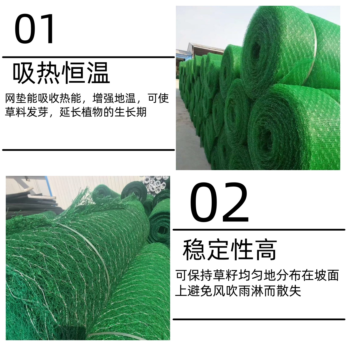 3. 生态环保:材质环保无污染,可自然降解,不会对土壤和环境造成任何危害。在护坡固土的同时,促进植被生长,实现生态修复,美化环境,打造绿色家园。