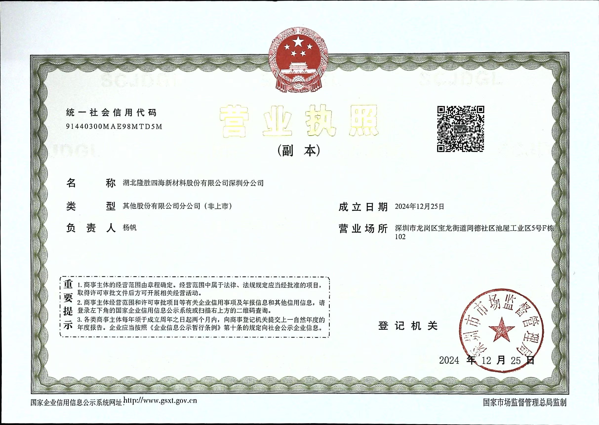 湖北隆胜四海新材料股份有限公司深圳分公司